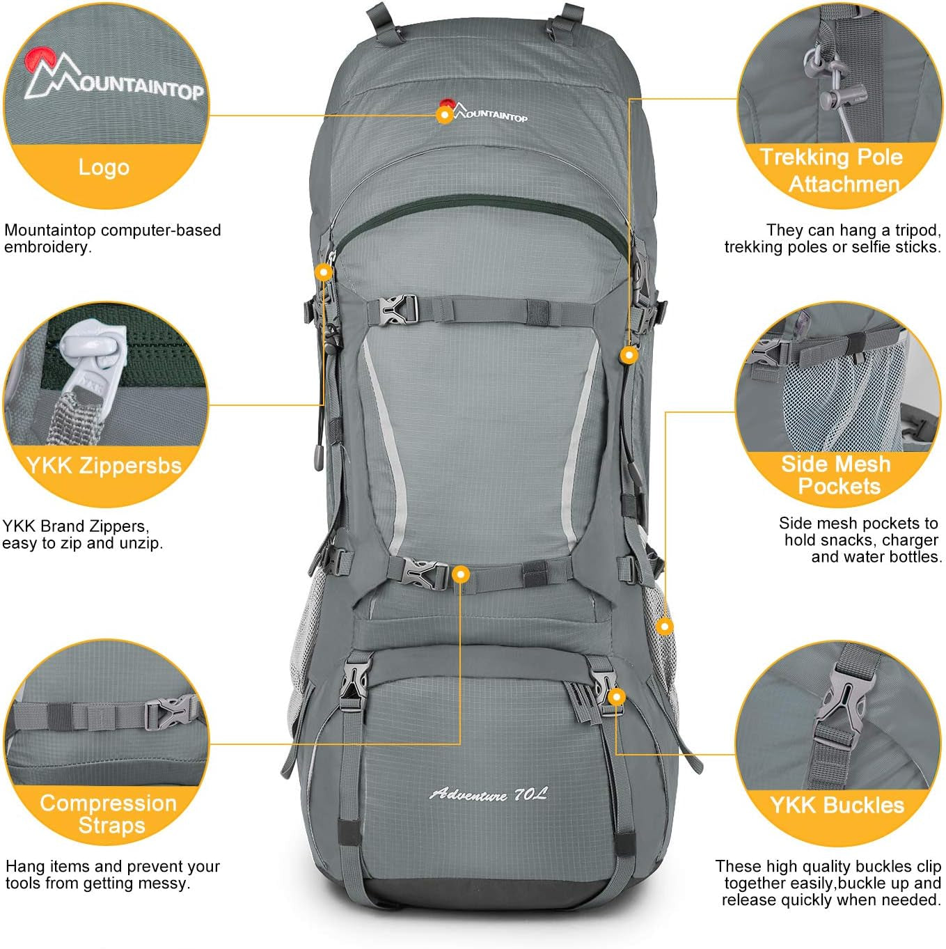 70L Internal Frame Hiking Backpack for Men Women with Rain Cover, 29.9 * 13 * 10.2In, Gray